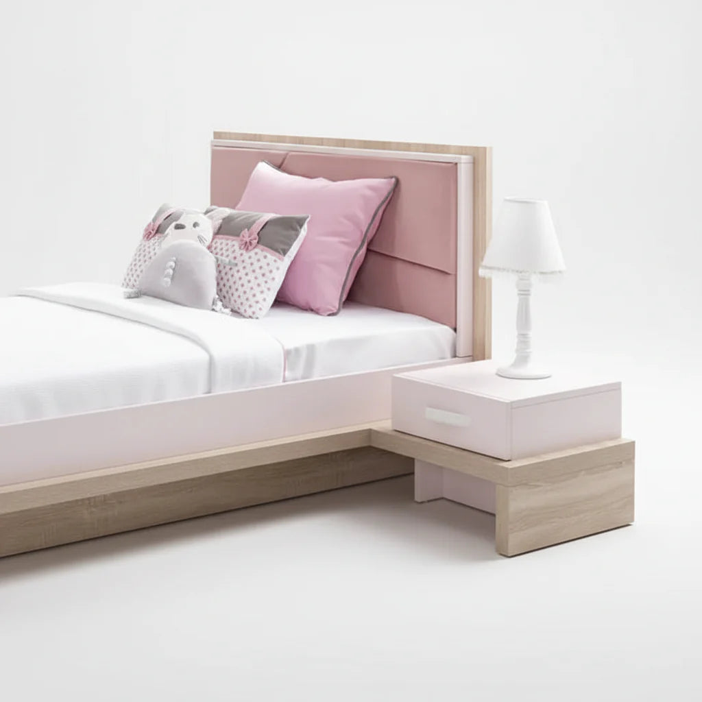 Komo Angel është një zgjedhje praktike dhe elegante për dhomën e fëmijëve apo adoleshentëve. Me kombinimin e ngjyrave pastel dhe efektit të drurit, ajo krijon një ambient të ngrohtë dhe harmonik pranë krevatit.