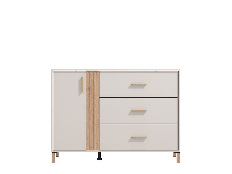 Struktura përfshin një dollap me derë dhe tre sirtarë të bollshëm, idealë për ruajtjen e rrobave, dokumenteve apo sendeve personale. Kombinimi i ngjyrës neutrale me detajet në efekt druri krijon një pamje të pastër, të ndritshme dhe lehtësisht të kombinueshme me mobilie të tjera. Dorezat me dizajn minimalist dhe këmbët e holla i japin mobilies një stil modern skandinav.