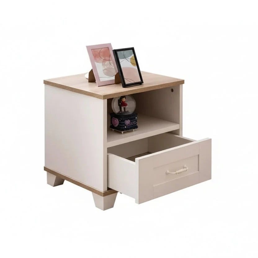 Kjo komodinë elegante me dizajn të thjeshtë dhe ngjyra neutrale është zgjidhja ideale për organizimin e rrobave dhe aksesorëve në dhomën e gjumit. Kombinimi i trupit të bardhë me sipërfaqen në efekt druri krijon një pamje të ngrohtë dhe moderne që përshtatet lehtësisht me stile të ndryshme interieri.