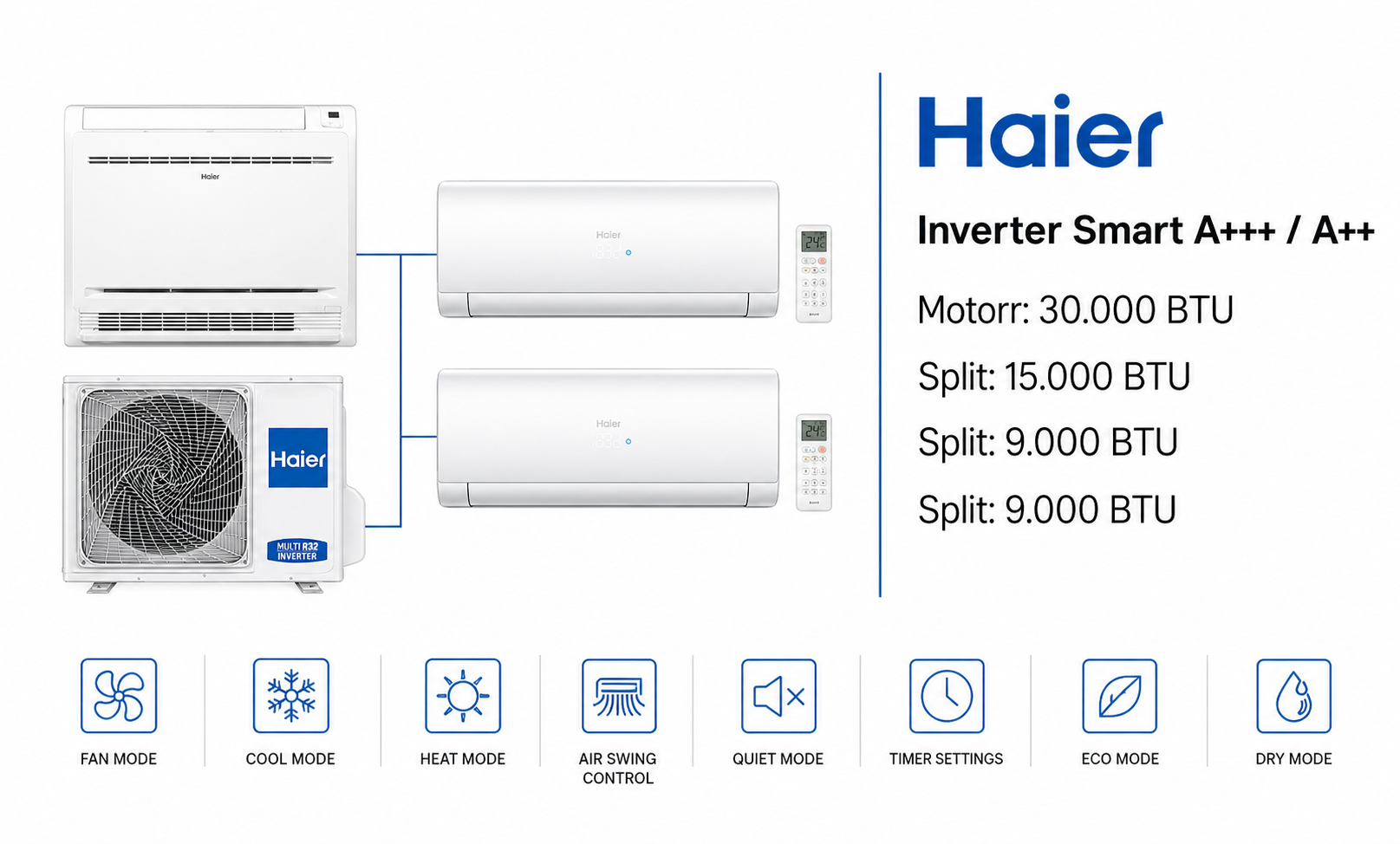 Kondicioneri Multi Split Haier është një sistem i avancuar për klimatizimin e disa ambienteve njëkohësisht, duke ofruar performancë të lartë dhe efikasitet energjie. Ky konfigurim përfshin një njësi të jashtme me kapacitet 30,000 BTU dhe tre njësi të brendshme (15,000 BTU dhe 2 x 9,000 BTU), duke mundësuar shpërndarje optimale të ajrit në disa dhoma.