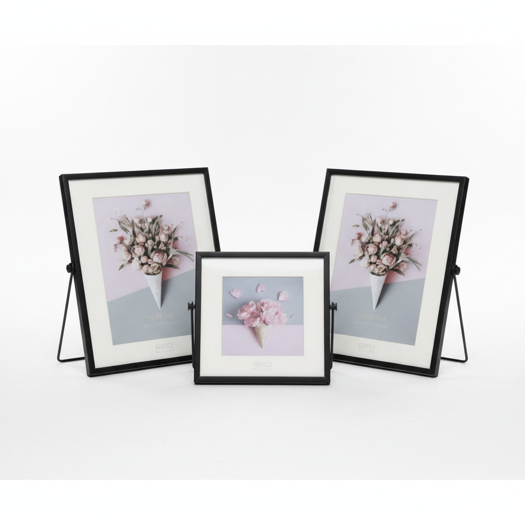 Set prej tre kornizash elegante të zeza me paspartu të bardhë, ideale për dekorimin e tavolinave dhe sipërfaqeve në shtëpi. Kornizat shumëpërmasëshe krijojnë një paraqitje të rregullt dhe moderne për fotot ose artet tuaja.