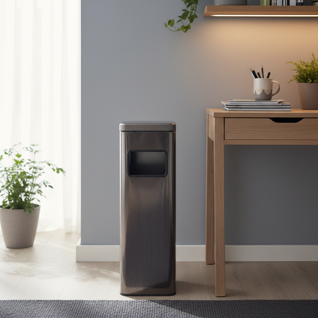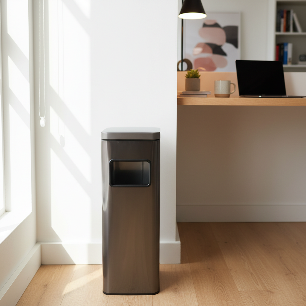 Kosh i lartë për mbeturina cigare me dizajn katror dhe pamje elegante metalike në ngjyrë të errët, i përshtatshëm për ambiente të brendshme ose hyrje biznesesh. Hapja frontale e bën hedhjen e bishtave të cigareve të thjeshtë dhe higjienik.