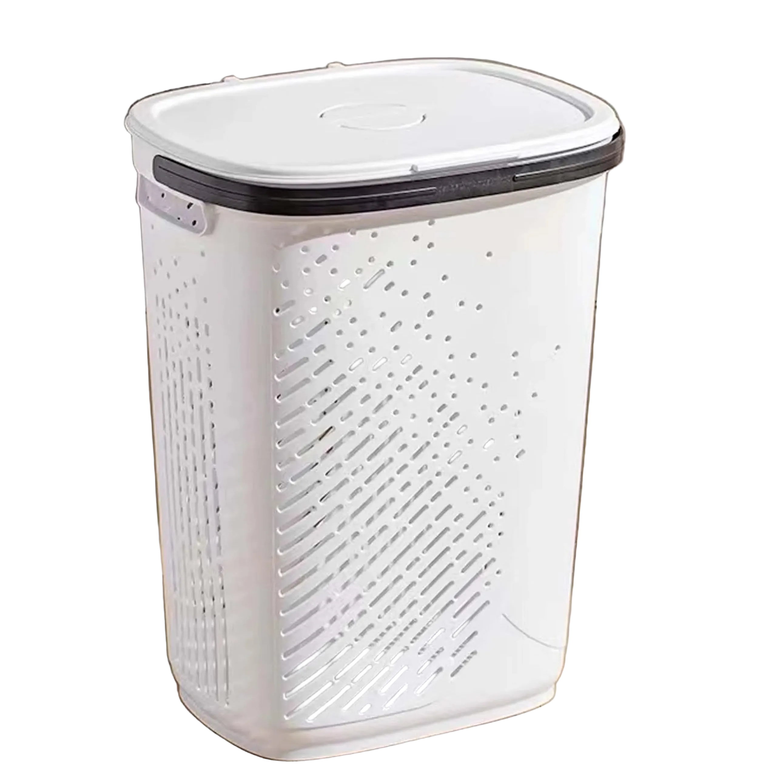 Kosh praktik për rrobat e përditshme, i projektuar për të mbajtur ambientin e pastër dhe të organizuar. Struktura me vrima siguron ajrosje të mirë, duke parandaluar mbajtjen e lagështisë dhe aromave, ndërsa kapaku mbron përmbajtjen dhe i jep një pamje të rregullt hapësirës.