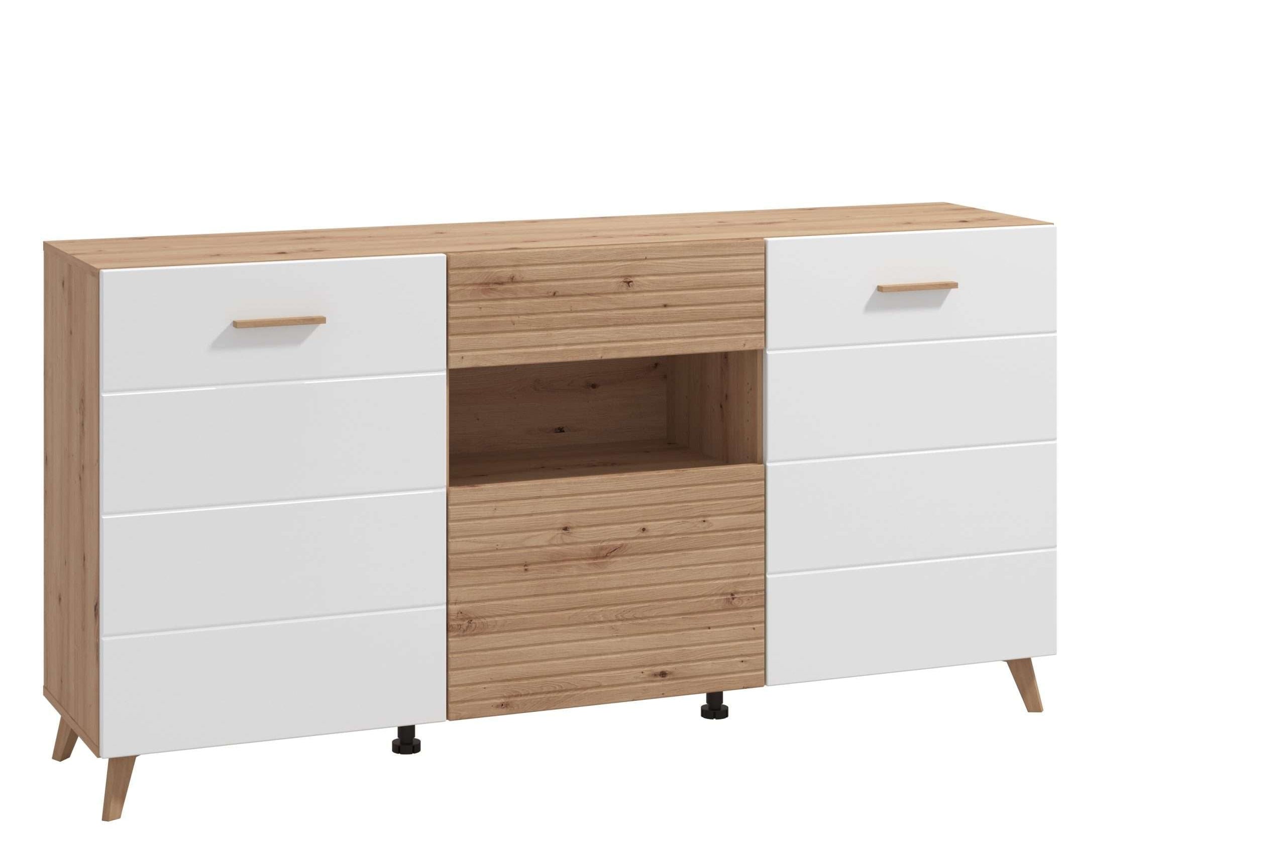 Kredencë Brendon është një zgjedhje moderne dhe funksionale për ambientin e sallonit apo dhomës së ndenjës. Kombinimi i ngjyrës së bardhë me nuancat natyrale të drurit krijon një pamje elegante dhe të ngrohtë, që përshtatet lehtësisht me stile të ndryshme interieri. Hapësirat e bollshme me sirtarë dhe raft të hapur ofrojnë organizim praktik për aksesorë, libra apo pajisje multimediale.