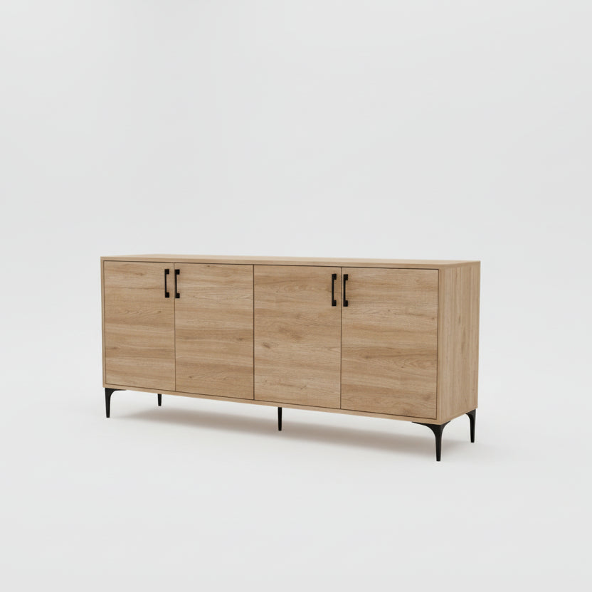 Kapacitet i Shkëlqyer Magazinimi: E pajisur me katër dyer të gjera, kjo kredencë ofron një hapësirë të brendshme shumë bujare. Është perfekte për të sistemuar enët e kuzhinës, gotat, mbulesat e tavolinës, apo çdo aksesor tjetër që dëshironi të mbani të organizuar dhe larg syve.