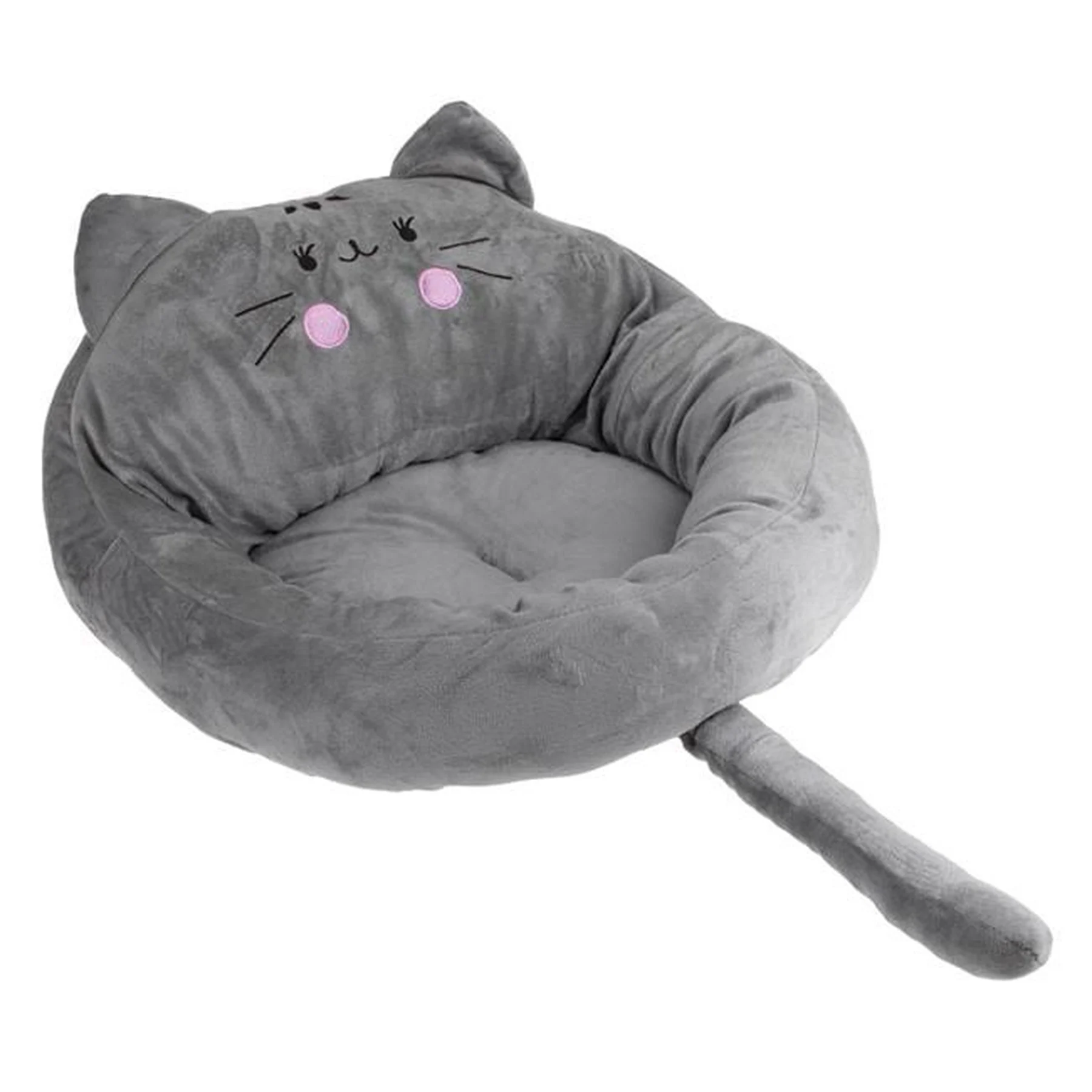 Krevat për mace në ngjyrë gri me sipërfaqe kadife mbrapa 24cm me qëndisje maceje, veshë dhe bisht 3D, i cili do të jetë një lodër e bukur për macen. Ka një fund të zi të papërshkueshëm nga uji. Udhëzimet e kujdesit: Temperatura maksimale e larjes deri në 30°C. Mos përdorni zbardhues ose klor. Hekurosja nuk lejohet. Mos e thani në tharëse.