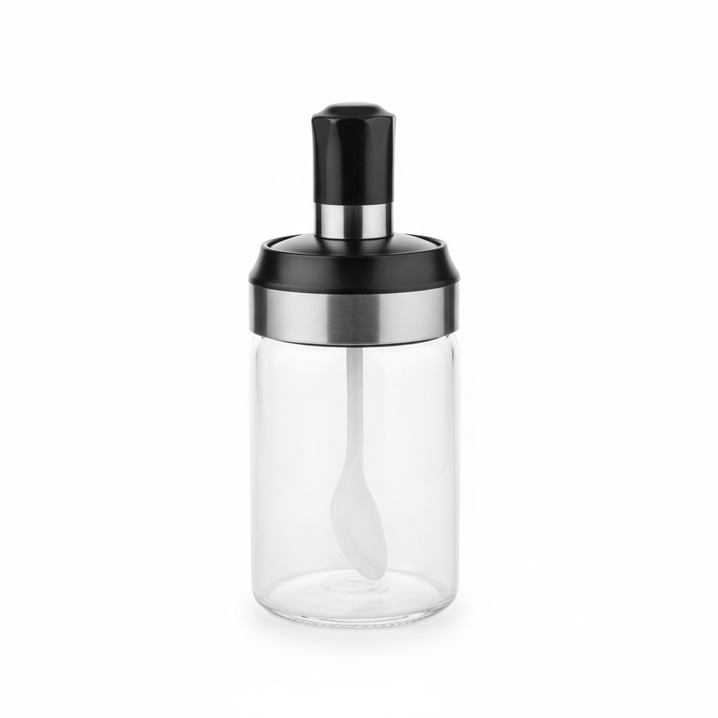 Enë praktike prej qelqi 200 ml, ideale për ruajtjen e kripës ose erëzave të preferuara në banakun e kuzhinës. Trupi transparent lejon të shihni sasinë e përmbajtjes, ndërsa kapaku me vidhosje dhe unazë metalike mbron nga lagështia dhe mbajtja e aromës. Lugëza e integruar brenda enës siguron dozimin e saktë dhe higjienik gjatë përdorimit të përditshëm.