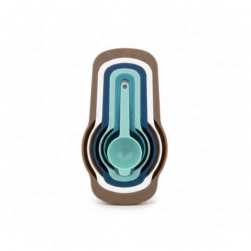 Seti i lugëve matëse me dizajn të vendosjes njëra brenda tjetrës ofron matje të sakta dhe organizim praktik për çdo kuzhinë. Ngjyrat blu dhe të bardhë e bëjnë të lehtë dallimin e madhësive gjatë gatimit.