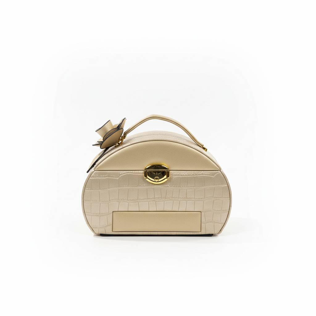 Kjo kuti bizhuterish me një nivel kombinon organizimin praktik me dizajnin elegant, duke ruajtur aksesorët tuaj në mënyrë të sigurt dhe të rregullt. Pamja luksoze me ngjyrë ari të hapur e bën një aksesor dekorativ për çdo tavolinë tualeti.
