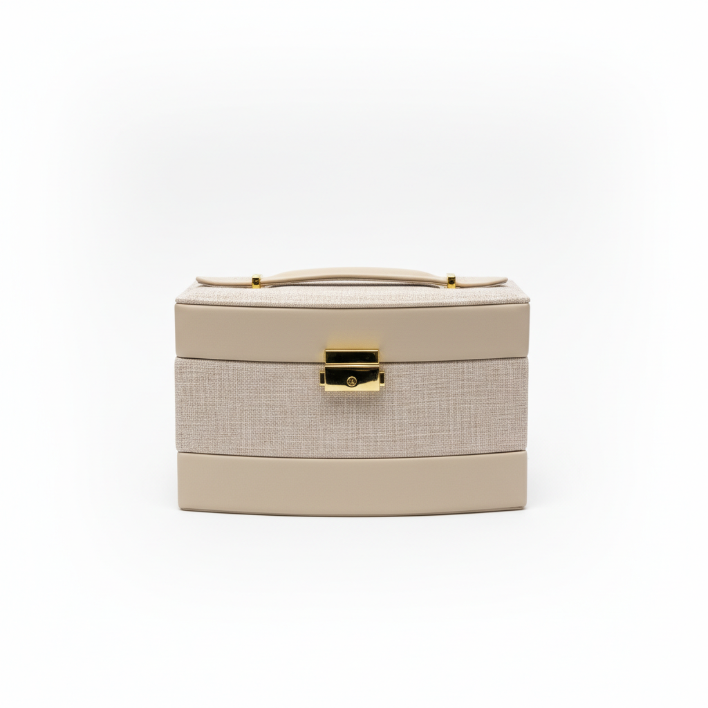 Kutia e bizhuterive me 2 nivele ofron organizim elegant për aksesorët tuaj, me dizajn modern në nuanca bezhe/kremi dhe mbyllje metalike në ngjyrë ari. Pjesa e jashtme me strukturë pëlhure dhe detaje lëkure sintetike e bëjnë të përshtatshme si për përdorim të përditshëm ashtu edhe si dekor.