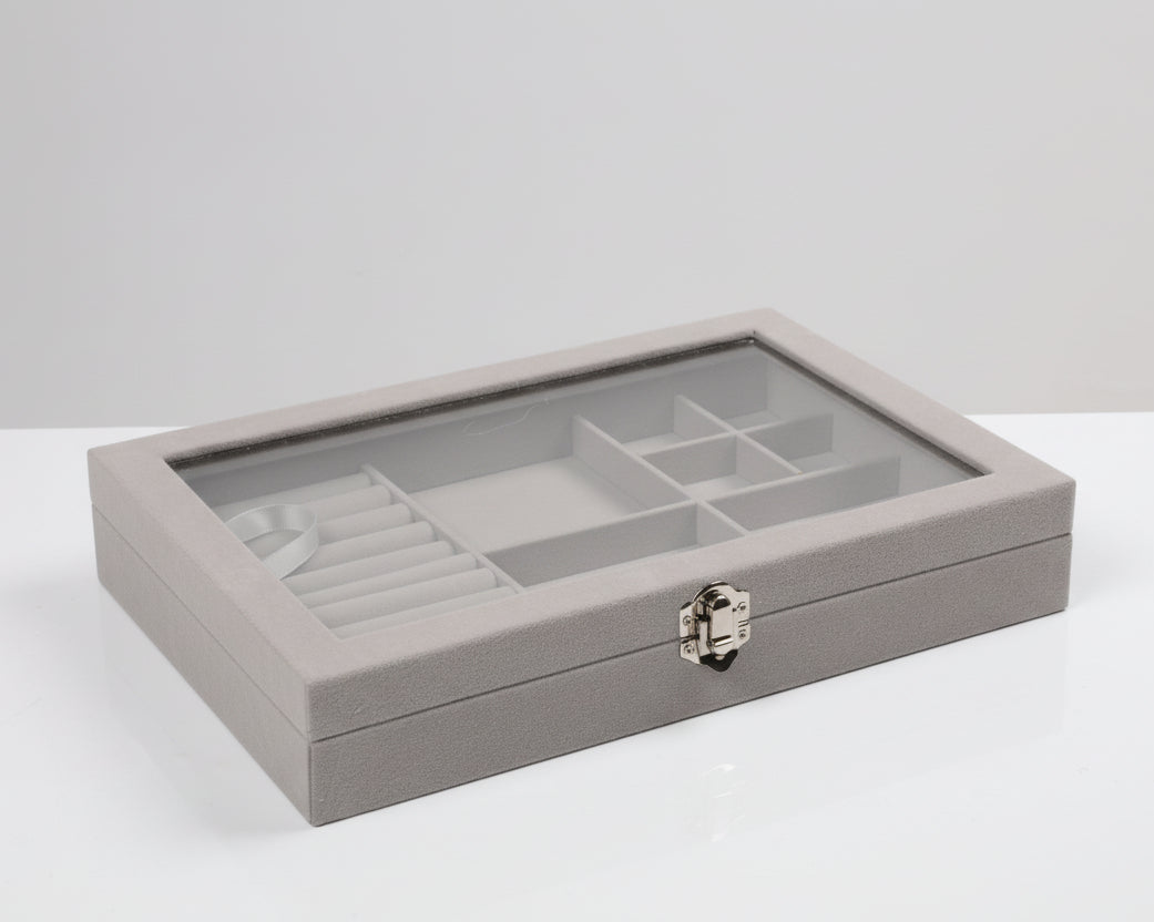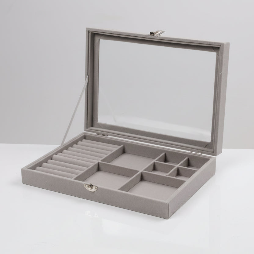 Kjo kuti organizimi për bizhuteri është zgjidhja ideale për të ruajtur dhe ekspozuar aksesorët tuaj me stil. E veshur me material të butë dhe me kapak transparent xhami, ajo ju lejon të shihni përmbajtjen pa e hapur, duke kombinuar funksionalitetin me estetikën.