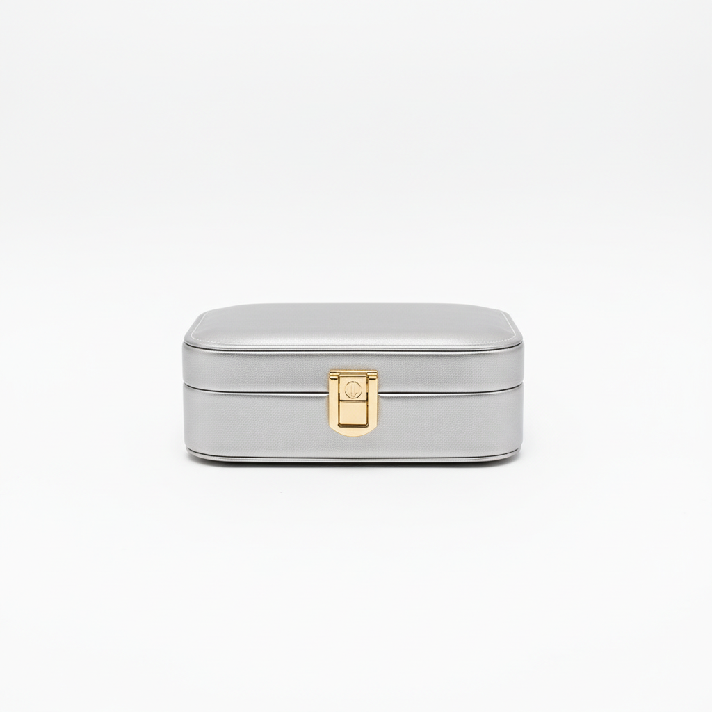 Kuti e vogël bizhuterish me përfundim bezhë shampanj, ideale për ruajtjen elegante të aksesorëve tuaj në shtëpi ose në udhëtim. Dizajni kompakt dhe mbyllja metalike në ngjyrë ari e bëjnë praktike dhe të sigurt.