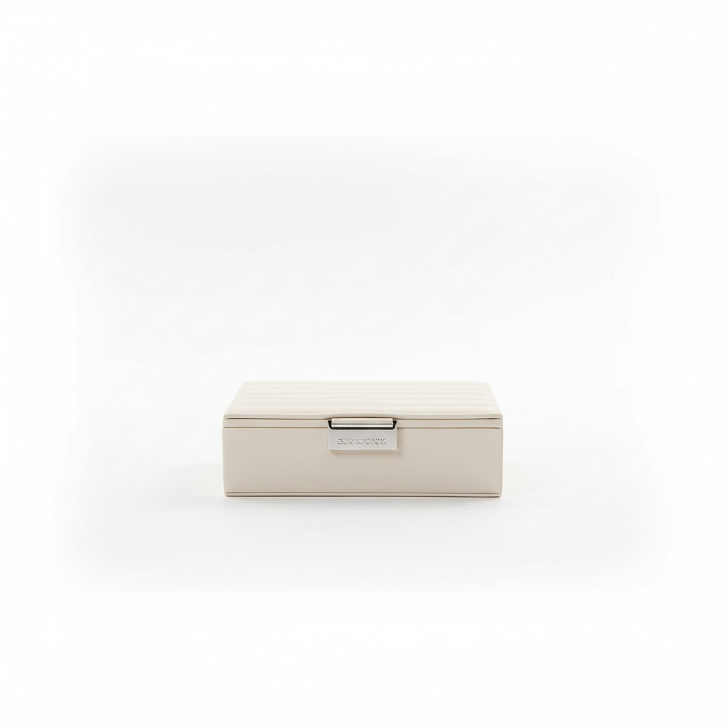 Kutia kompakte e bizhuterive me kapak të qepur dhe mbyllje metalike është zgjidhja ideale për organizimin elegant të aksesorëve tuaj në shtëpi ose gjatë udhëtimit.