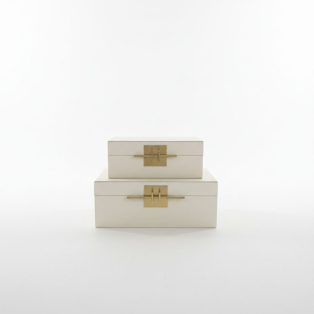 Kjo kuti bizhuterish bezhe me formë drejtkëndore organizon me stil bizhuteritë dhe aksesorët e vegjël. Dizajni modern minimalist dhe mbyllja metalike në ngjyrë ari e bëjnë një aksesor elegant për çdo ambient.