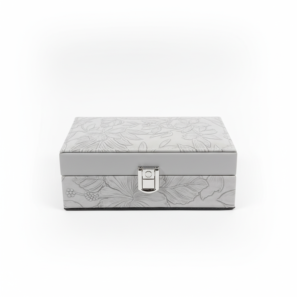 Kjo kuti drejtkëndore bizhuterish me reliev lulesh dhe ngjyrë gri të çelët ofron ruajtje elegante për aksesorët tuaj të preferuar. Madhësia kompakte e bën të lehtë mbajtjen në dorë dhe vendosjen kudo në shtëpi.