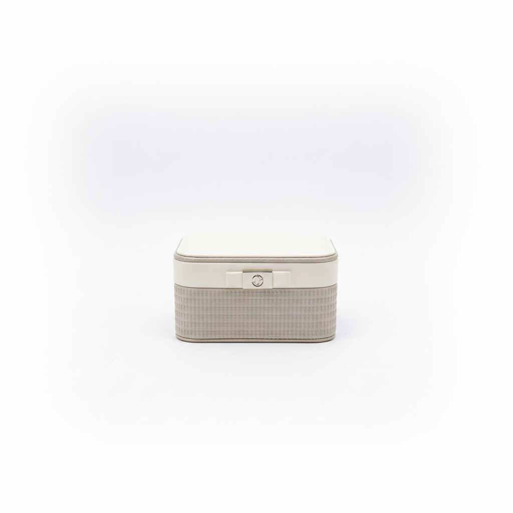 Kjo kuti kompakte bizhuterish me formë drejtkëndore ofron ruajtje elegante për aksesorët tuaj të përditshëm. Dizajni dyngjyrësh me kapak të çelët dhe bazë me teksturë e bën të përshtatshme si për udhëtim ashtu edhe për komodinë.
