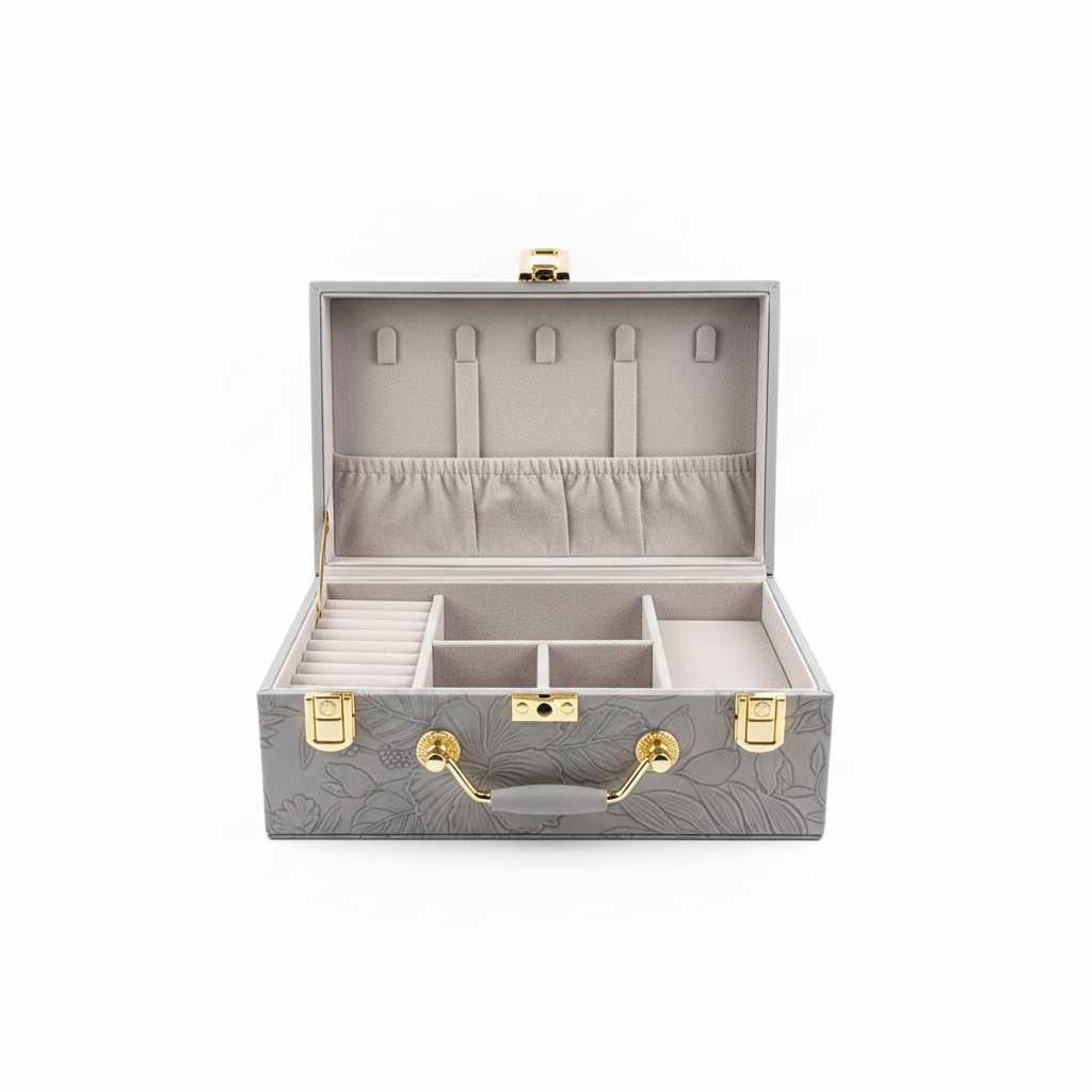 Kjo kuti elegante bizhuterish në nuancë gri vjen në formë valixheje me reliev lulesh dhe detaje metalike ngjyrë ari, ideale për ruajtjen me stil të aksesorëve tuaj të preferuar. Dizajni i saj i qëndrueshëm e bën të përshtatshme si për shtëpi ashtu edhe për ta marrë me vete.