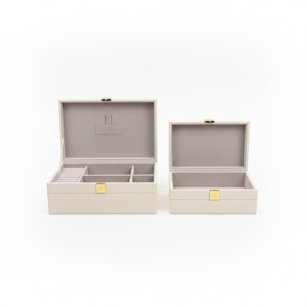 Set praktik me dy kuti bizhuterish në ngjyrë bezhë, me sipërfaqe të teksturuar dhe detaj elegant metalik në ngjyrë ari. Ideale për ruajtje dhe organizim të thjeshtë të bizhuterive tuaja.