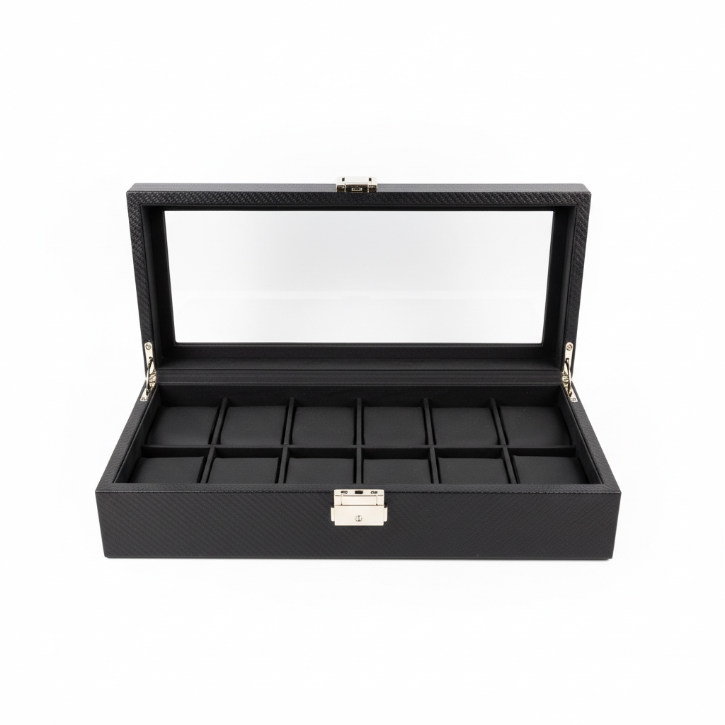 Kjo kuti elegante e zezë ruajtëse për ora ofron 12 vende të veçanta me jastëkë të mbushur dhe kapak xhami për ekspozim të qartë. Forma drejtkëndore dhe mbyllja metalike e bëjnë ideale për organizim dhe prezantim të koleksionit tuaj.