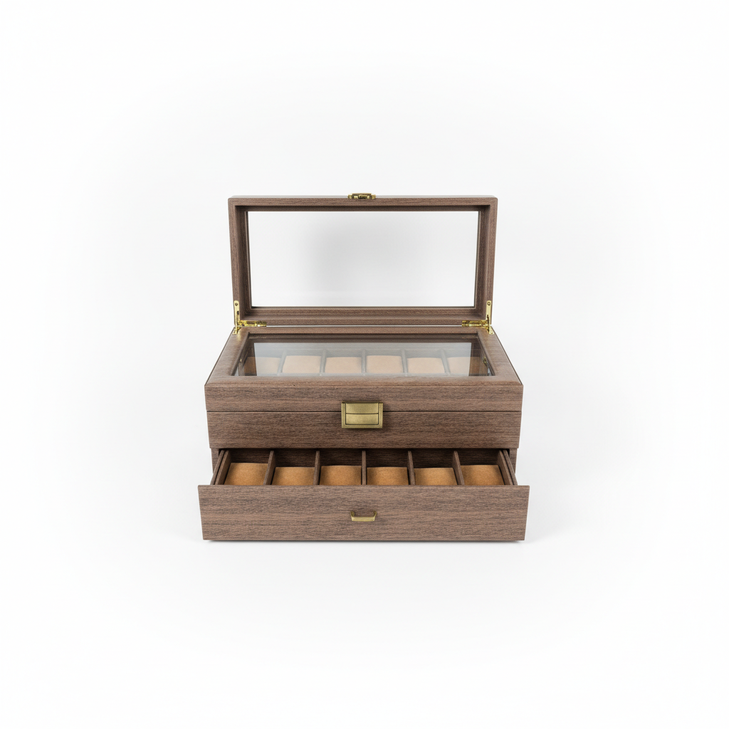 Kjo kuti elegante ruajtjeje për ora mban deri në 24 copë dhe kombinon pamjen gri të drurit me kapakun transparent për ekspozim të lehtë. E përkryer për organizimin dhe mbrojtjen e koleksionit tuaj të orëve në një vend të vetëm.