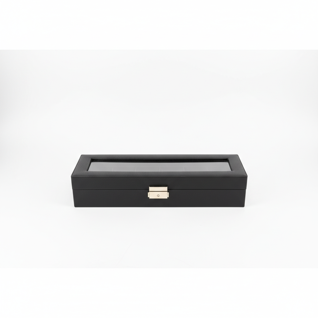Kuti elegante ruajtëse për 6 ora, me ngjyrë të zezë dhe kapak të tejdukshëm për ekspozim të qartë. Ideale për organizimin dhe mbrojtjen e koleksionit tuaj të orëve.