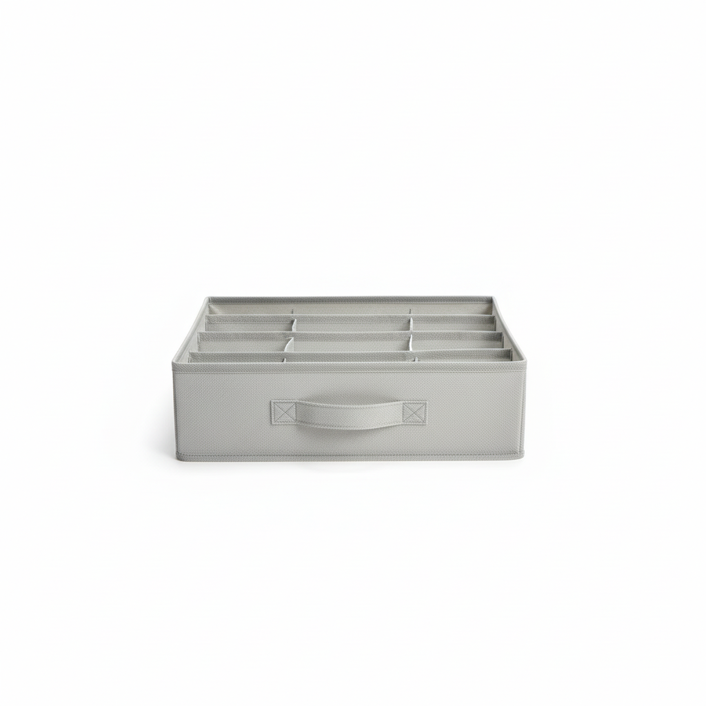Organizer drejtkëndor prej stofe me ndarje të brendshme që mban të rregullta rrobat dhe aksesorët në sirtarë, rafte ose dollapë. Dizajni i butë dhe i lehtë e bën të thjeshtë organizimin e hapësirës në shtëpi.