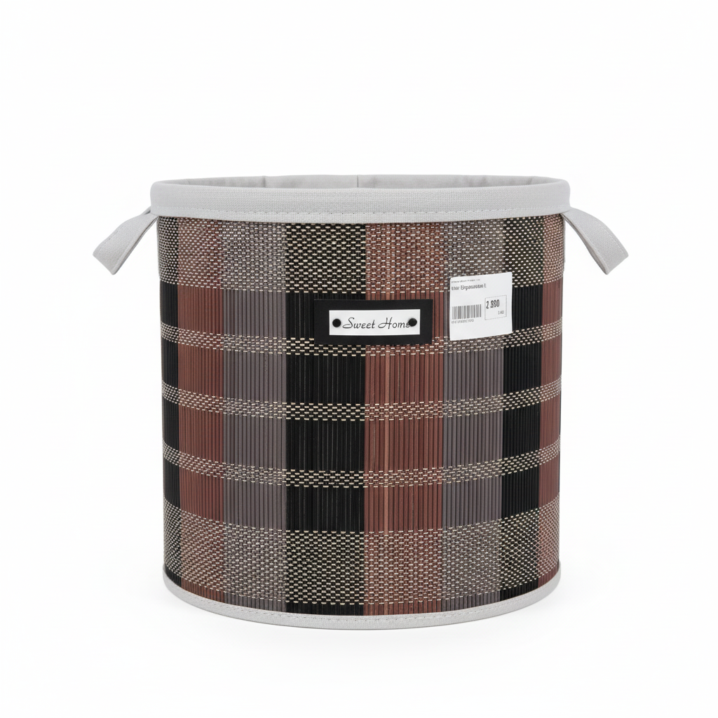Kuti organizative e madhe në formë cilindrike me model kockëz në nuanca kafe dhe të zeza, e dekoruar me badge metalike "Sweet Home" në pjesën e përparme. Ideale për ruajtjen dhe organizimin e sendeve në shtëpi.