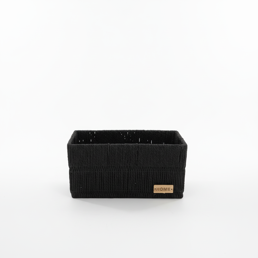 Kutia organizative në madhësi L ofron hapësirë të bollshme ruajtjeje dhe stil modern me dizajn të gërshetuar në ngjyrë të zezë. Forma drejtkëndore dhe etiketa dekorative prej druri me mbishkrimin "HOME" e bëjnë ideale për organizimin e hapur në çdo ambient.