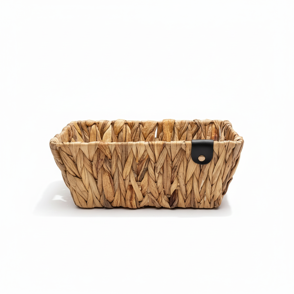 Shporta drejtkëndore e endur nga fibra natyrale në ngjyrë kafe ofron zgjidhje praktike dhe dekorative për organizimin në shtëpi. Dizajni i hapur e bën të lehtë vendosjen dhe marrjen e sendeve nga raftet apo sipërfaqet e punës.