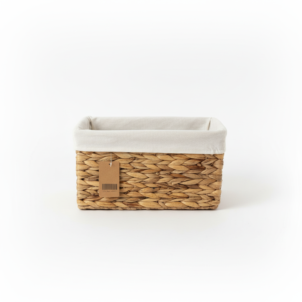 Kjo kuti organizative me formë drejtkëndore kombinon pamjen natyrale të materialit të thurur me brendësinë prej cope të bardhë, ideale për ruajtje dhe organizim në shtëpi. Dizajni i hapur nga sipër mundëson vendosjen dhe marrjen e lehtë të sendeve të përditshme.
