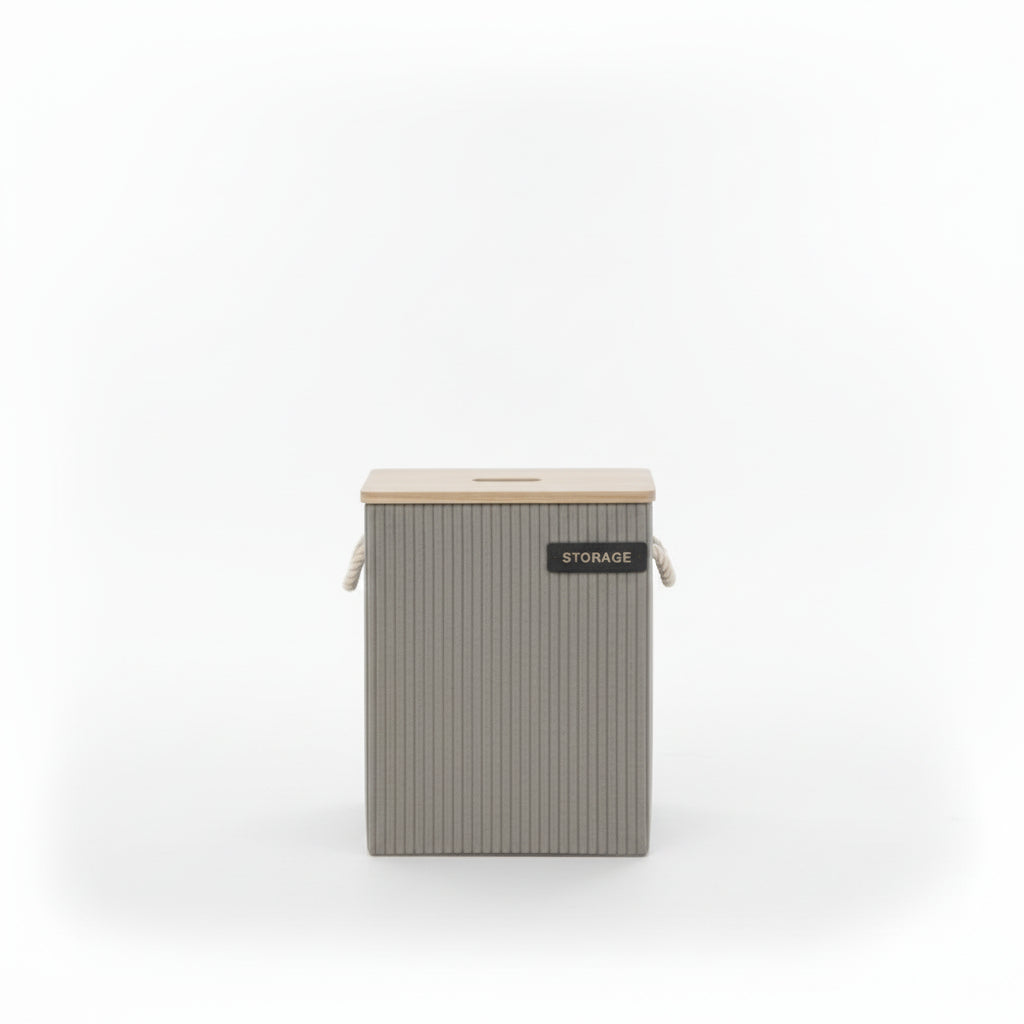 Materiali tekstil me strukturë vertikale i jep një pamje të pastër dhe të rregullt, ndërsa kapaku prej druri e mbron përmbajtjen nga pluhuri dhe krijon një estetikë natyrale. Dorezat anësore me litar e bëjnë të lehtë për t’u lëvizur dhe transportuar.