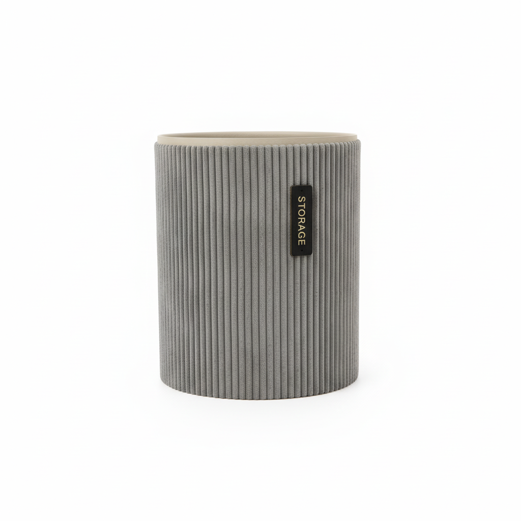 Organizer cilindrik XL me strukturë të fortë dhe sipërfaqe gri me teksturë me vija, i përshtatshëm për ruajtjen e objekteve në dysheme. Etiketa anësore me mbishkrimin “STORAGE” e bën të lehtë identifikimin e funksionit të saj.