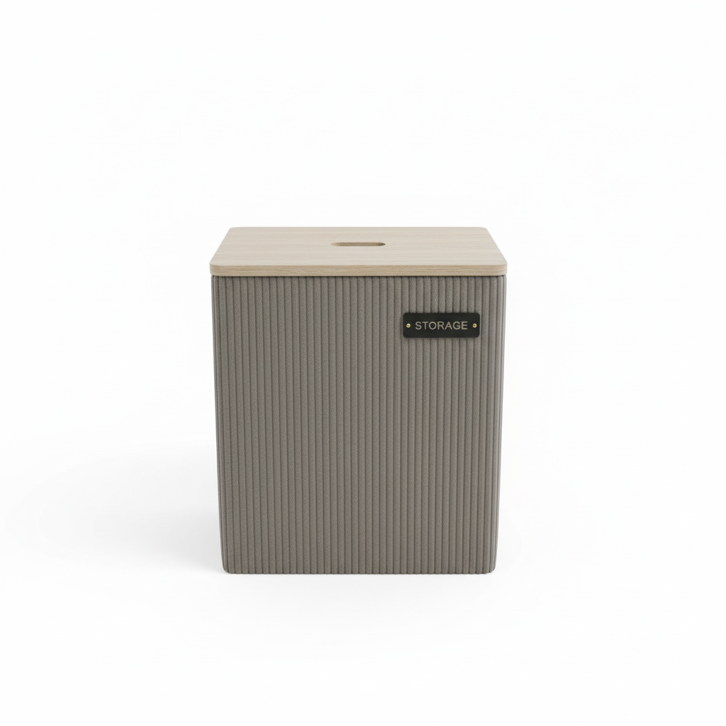 Kjo kuti organizative XXL me material me vija dhe kapak druri ofron zgjidhje elegante për ruajtjen e sendeve në çdo ambient të shtëpisë. Ngjyra gri neutrale dhe dizajni i thjeshtë e bëjnë të lehtë kombinimin me çdo stil mobilimi.