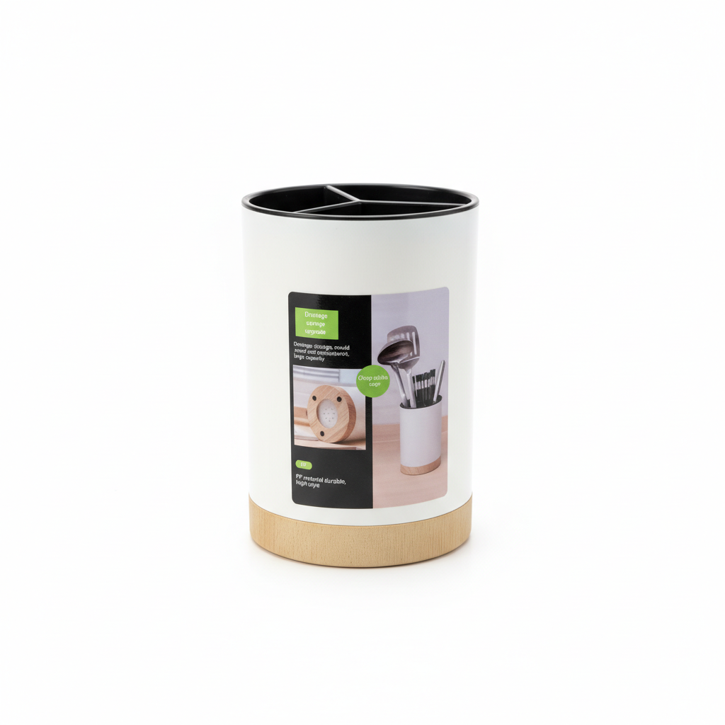 Ky mbajtës cilindrik me kapacitet të madh ndihmon të sistemoni shkopinjtë, pirunjtë, thikat dhe lugët në disa ndarje të brendshme praktike. Baza me pamje dru-effekt i jep një stil natyral kuzhinës, ndërsa plastika PP e qëndrueshme siguron përdorim afatgjatë.
