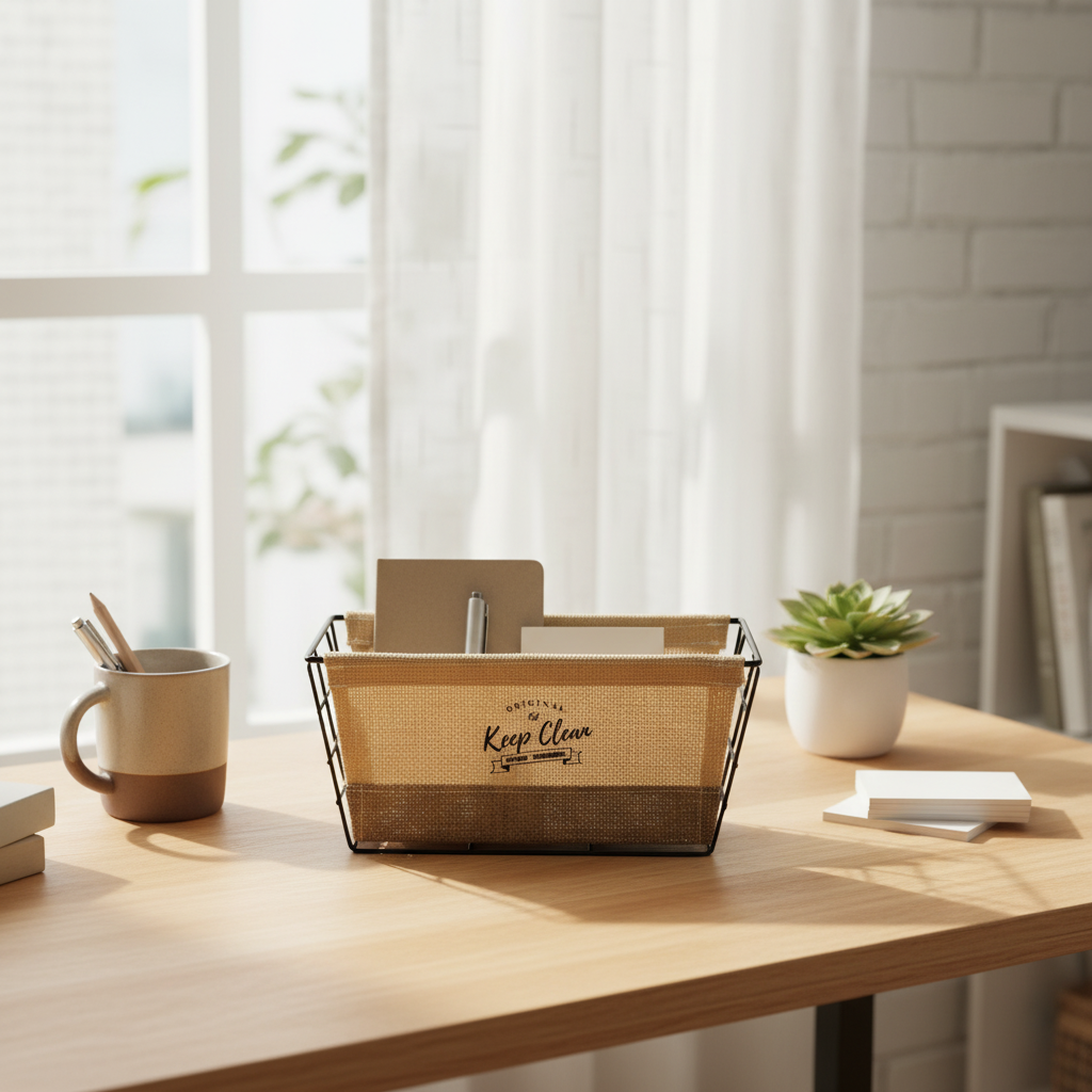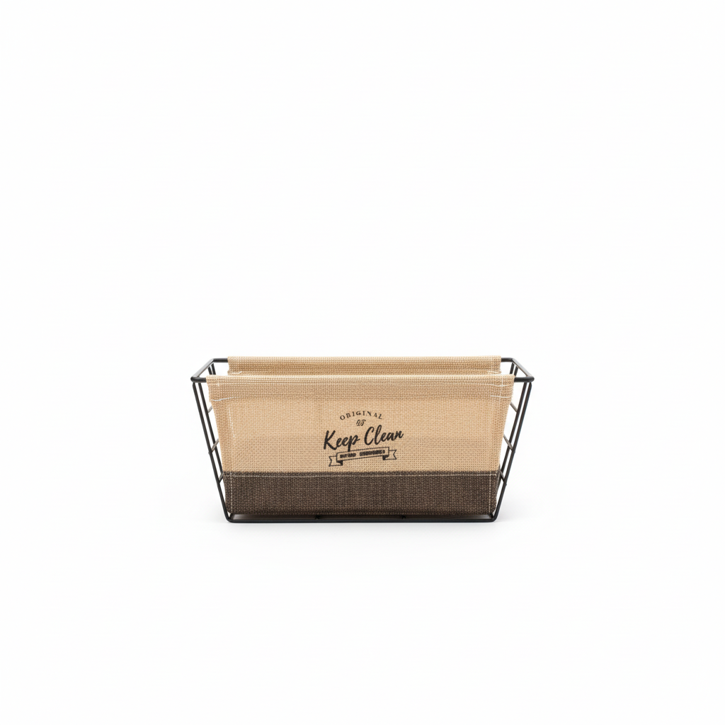 Shporta e organizimit me tekstil “Original Keep Clean” kombinon kornizën metalike me xhepa stofi në stil liri, ideale për renditjen e sendeve të vogla në shtëpi apo zyrë.