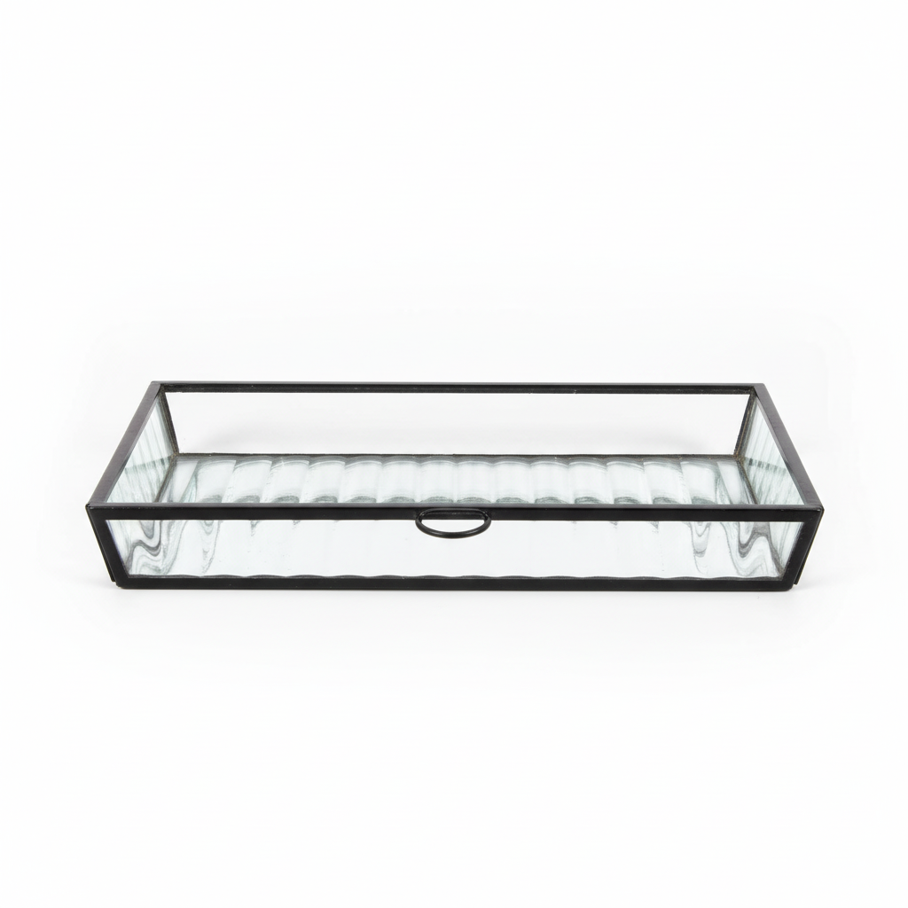 Kjo kuti qelqi drejtkëndore me panele të brinjëzuara dhe kornizë metalike të zezë organizon me stil bizhuteritë dhe aksesorët e vegjël në çdo sipërfaqe tavoline. Dizajni i tejdukshëm e bën përmbajtjen të dukshme dhe e kthen ruajtjen në element dekorativ.