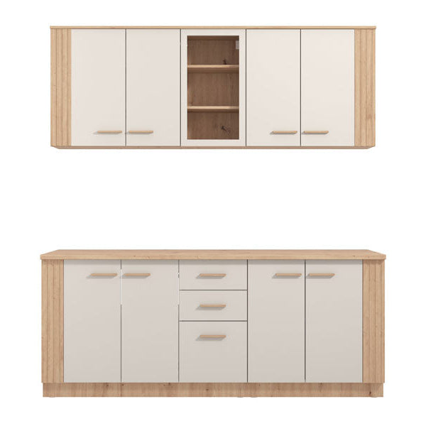 Organizim Inteligjent: Me një gjerësi prej 200 cm, kjo kuzhinë shfrytëzon çdo centimetër. Ofron hapësira të mbyllura për enët e mëdha, një modul me xham për të ekspozuar gotat tuaja të preferuara, dhe një set sirtarësh praktikë për lugë/pirunë dhe aksesorë të vegjël.