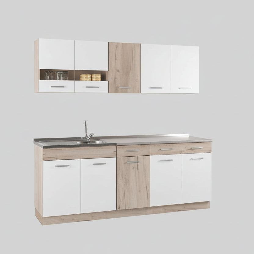 Kuzhina Dalia 200 cm është një zgjedhje ideale për mobilim, duke ofruar një kombinim të bukur mes funksionalitetit dhe dizajnit modern. Me linja të pastra dhe ngjyra neutrale, kjo kuzhinë përshtatet lehtësisht në ambiente të ndryshme, duke krijuar një hapësirë të organizuar dhe estetike për gatim dhe përditshmëri.