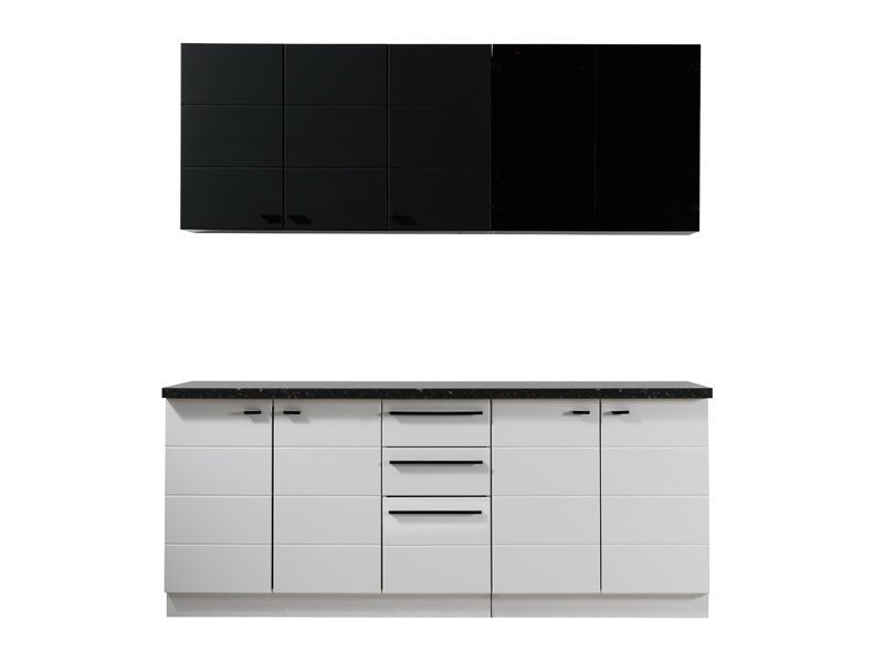 Organizim Perfekt: Me gjerësi 200cm, ajo përfshin një bllok qendror me 3 sirtarë funksionalë për takëme, si dhe dollapë të bollshëm me një dhe dy kanate për enët e mëdha.