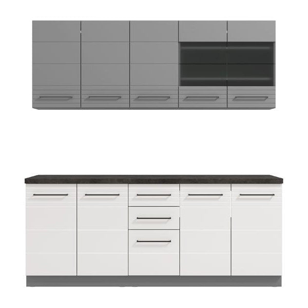 Ky kontrast midis shkëlqimit të bardhë dhe elegancës mat të grisë plotëson çdo standard estetik për arredimin e ambienteve moderne. Përveç pamjes, ajo është projektuar për funksionalitet maksimal, duke ofruar hapësira të organizuara në mënyrë praktike si në elementët e poshtëm ashtu edhe në ata të varur (të sipërm).