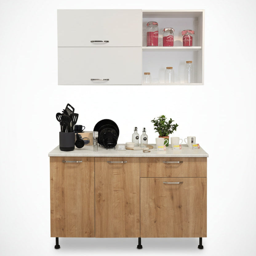 Pavarësisht përmasave kompakte, modeli Simpel është i organizuar me zgjuarsi për të përfshirë gjithçka që ju nevojitet: hapësirë për lavaman, zonë pune/gatimi dhe dollapë të mjaftueshëm për të mbajtur enët dhe ushqimet bazë të sistemuara. Është zgjidhja më praktike dhe ekonomike në treg.
