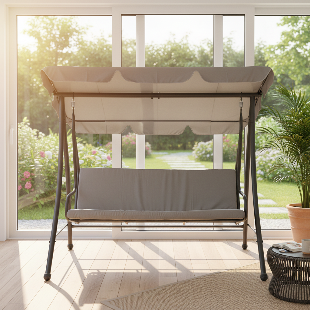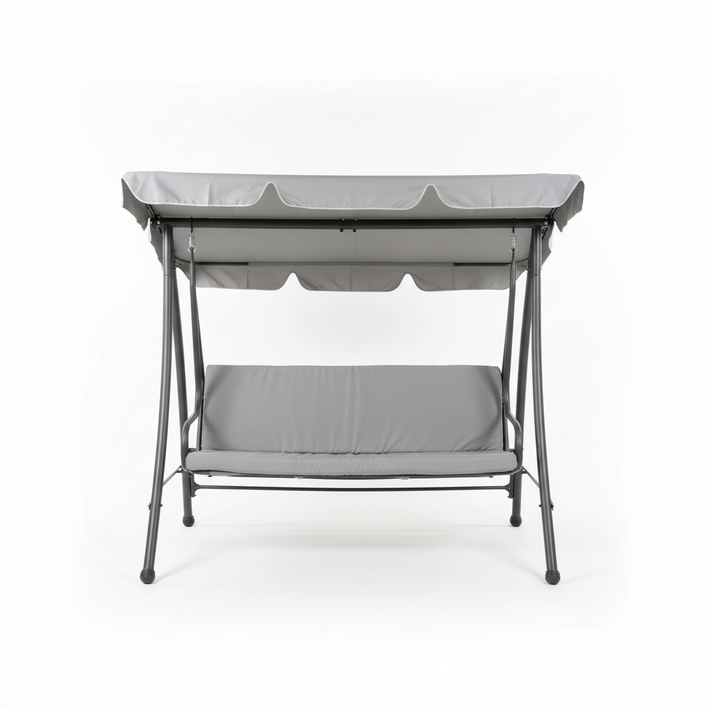 Kjo lëkundëse elegante për ambiente të jashtme është zgjidhja ideale për relaks në oborr, kopsht apo tarracë. Me kapacitet për tre persona, ajo krijon një hapësirë komode për të kaluar kohë me familjen ose miqtë në ajër të pastër.