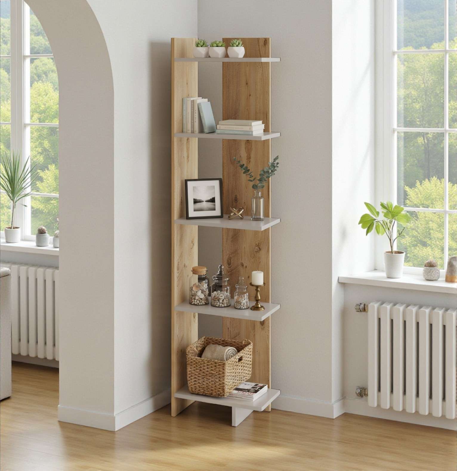 Mungesa e hapësirës nuk do të thotë mungesë stili. Biblioteka kolonë Hana është krijuar posaçërisht për të shfrytëzuar lartësinë e dhomës tuaj pa zënë shumë vend në dysheme. Me panelet e saj vertikale në ngjyrë druri dhe raftet elegante të bardha, ajo krijon një skulpturë funksionale në çdo qoshe.