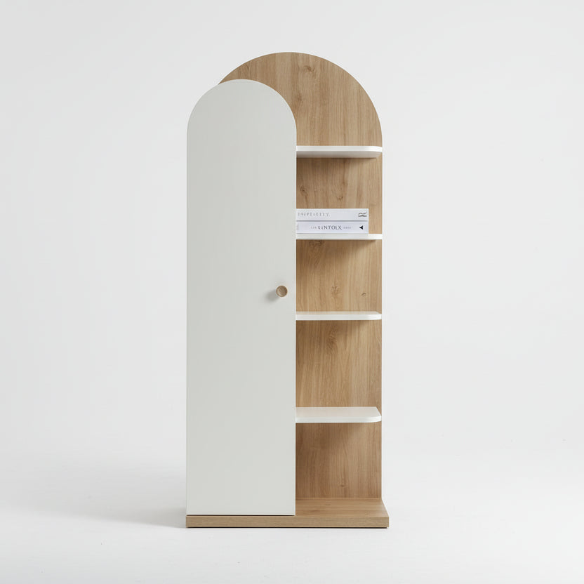 Kjo librari me dizajn modern është një zgjidhje elegante dhe funksionale për organizimin e librave dhe objekteve dekorative në çdo ambient. Forma e veçantë e derës së harkuar i jep mobiljes një pamje të butë dhe bashkëkohore, duke krijuar një element dekorativ të dallueshëm në hapësirë.