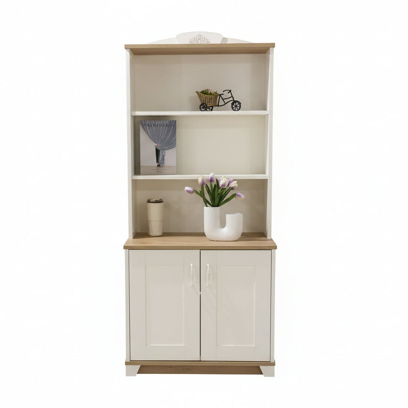 Kjo librari me komo kombinon funksionalitetin me një estetikë të pastër dhe elegante, duke u përshtatur lehtësisht në ambiente të ndryshme të shtëpisë. Dizajni në ngjyrë të bardhë, i kombinuar me sipërfaqen në nuancë druri natyral, krijon një pamje të ngrohtë dhe të rafinuar.