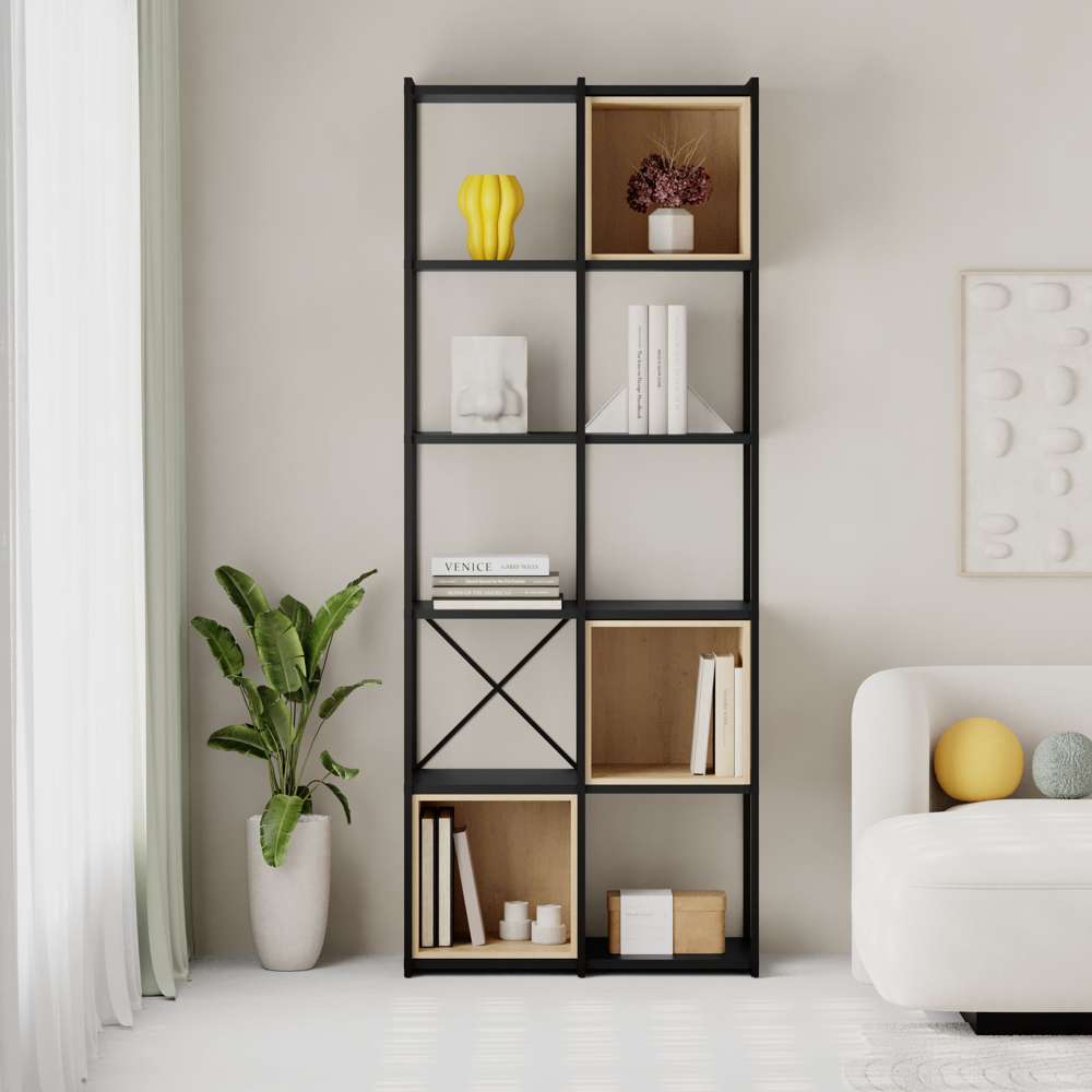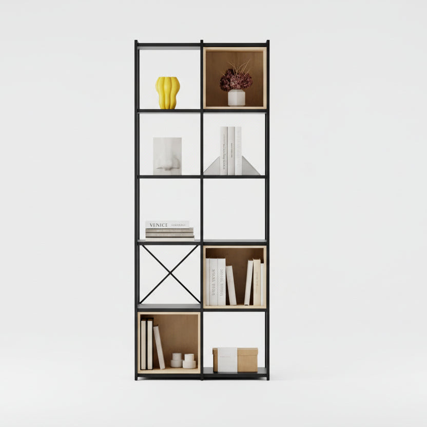 Kjo librari me strukturë metalike në ngjyrë të zezë dhe rafte me efekt druri sjell një kombinim perfekt mes stilit industrial dhe funksionalitetit modern. Dizajni me ndarje të hapura e bën ideale për organizimin e librave, dekorit apo aksesorëve të përditshëm, duke krijuar një pamje të rregullt dhe estetike.