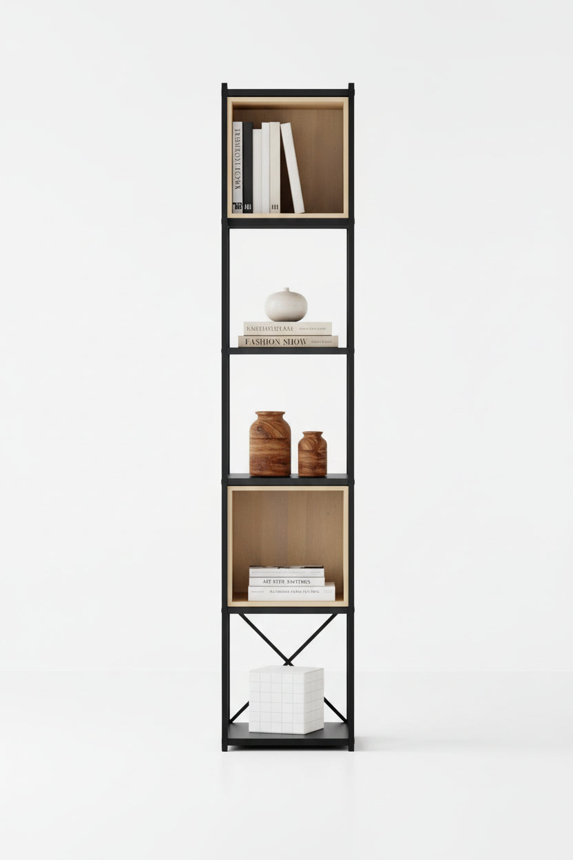 Kjo librari e ngushtë me strukturë metalike në ngjyrë të zezë dhe rafte me efekt druri është zgjidhja ideale për hapësira të vogla që kërkojnë stil dhe funksionalitet. Dizajni i saj vertikal e bën të përshtatshme për kënde të ndryshme të shtëpisë apo zyrës, duke ofruar organizim praktik pa zënë shumë vend.