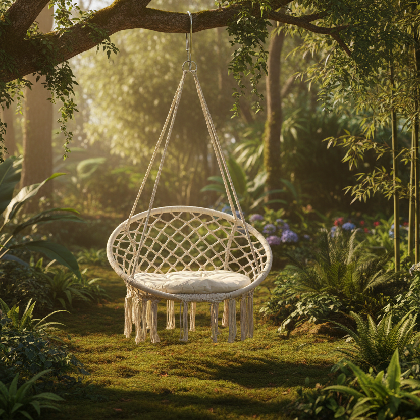 Jastëku i butë siguron rehati gjatë qëndrimit, ndërsa struktura e varur krijon një ndjesi të lehtë lëkundjeje për relaks maksimal.