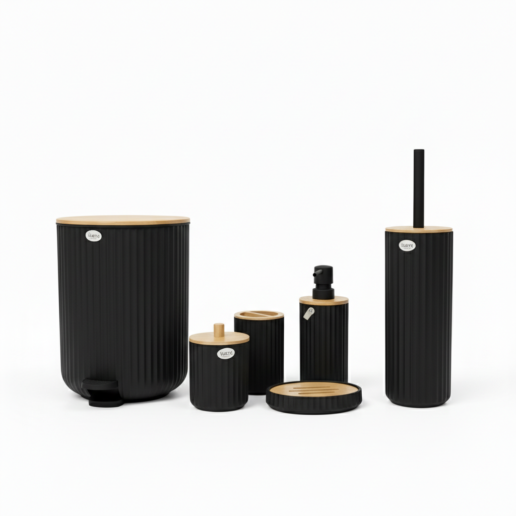 Seti 6‑pjesësh me dizajn ribbed të zi mat dhe kapakë elegantë në stil dru bambuje sjell menjëherë pamje të rregullt dhe luksoze në hapësirën tuaj. Materialet e kombinuara krijojnë kontrast të ngrohtë, duke e bërë të lehtë integrimin me mobiliet ekzistuese. Çdo aksesor është menduar për përdorim të përditshëm, duke ofruar funksionalitet dhe estetikë në të njëjtën kohë.