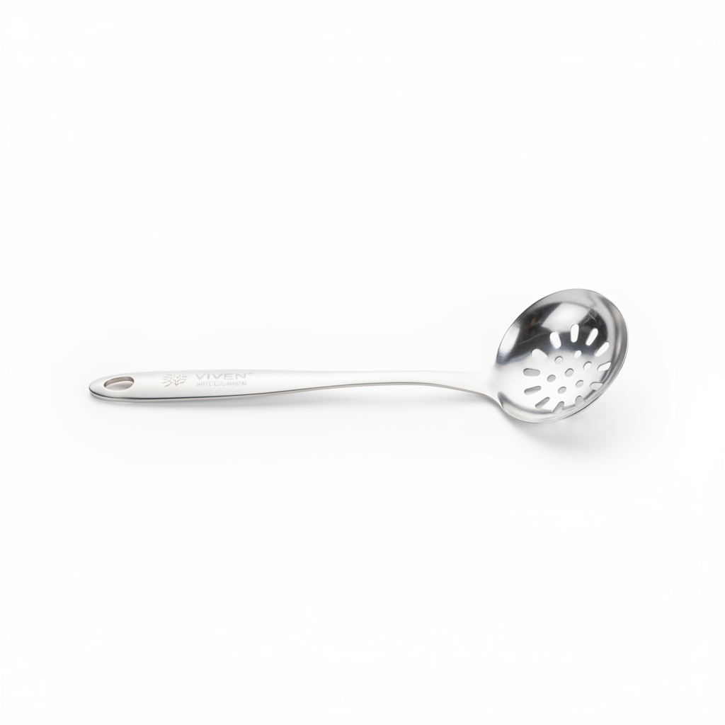 Luga skimmer prej çeliku inoks është mjeti ideal i kuzhinës për të kullluar lehtësisht lëngjet nga ushqimet gjatë gatimit dhe servimit.